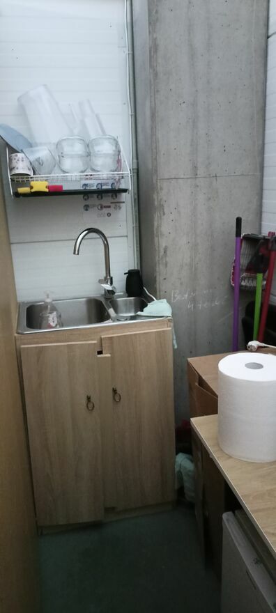 W pełni wyposażone zaplecze zgodne z wymogami sanepidu (dwukomorowy zlew z elektrycznym podgrzewaczem wody, czajnik, lodówka, mikrofala, dzbanek z filtrem)